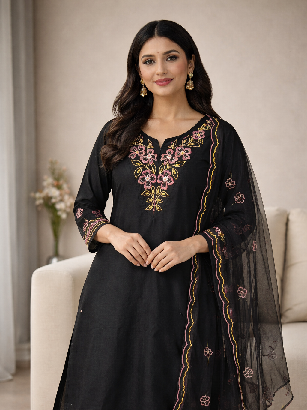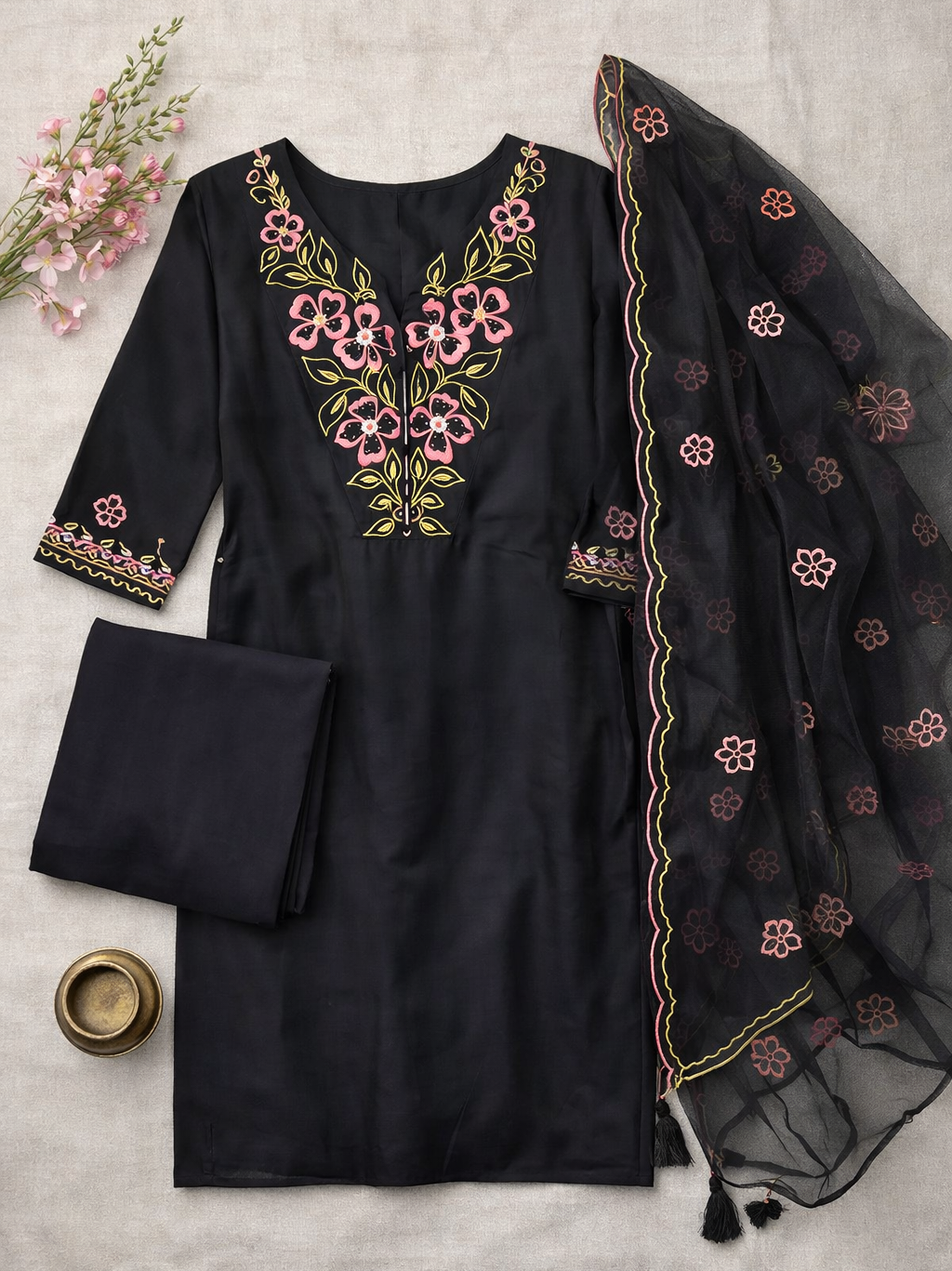 • Elegant Design: Black kurta set with delicate floral embroidery.